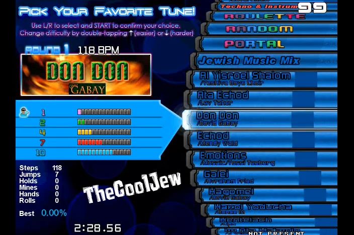 A project which is not about creating new music but reformatting the old, A Jewish Music Video Game! this exciting project is nearing completion. It is a Jewish dance game for the pc much like dance dance revolution but with better graphics and featuring popular artists/vocalists like Avraham Fried, Eli Gerstner and YBC, and Dovid Gabay (to mention a few), in which 2 minute cuts of the songs are taken and created to dance moves that you follow along to on a foam or metal dance pad hooked up to your pc and receive scores. Sometimes Jewish music songs are long and repetitive and thus for this game the best 2 minutes have been extracted out of every song. Check out these YouTube links: