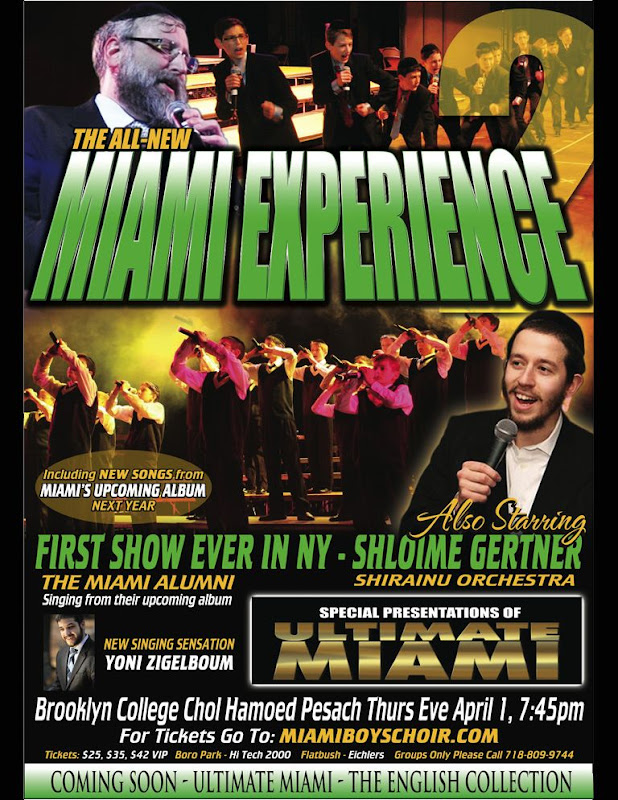 In addition, The MIAMI ALUMNI will accompany MIAMI on selected songs, and also present new material from their upcoming album. New singing sensation YONI ZIGELBOUM, heard at simchas throughout NY/NJ will make his Brooklyn College debut.
